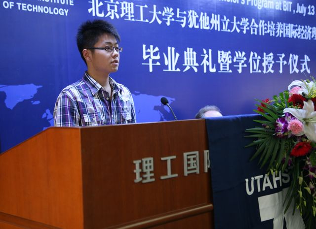 李璐同学代表全体毕业生发言,她用充满激情的语言对北京理工大学和犹他州立大学的悉心培养表达了感谢和感恩之情。