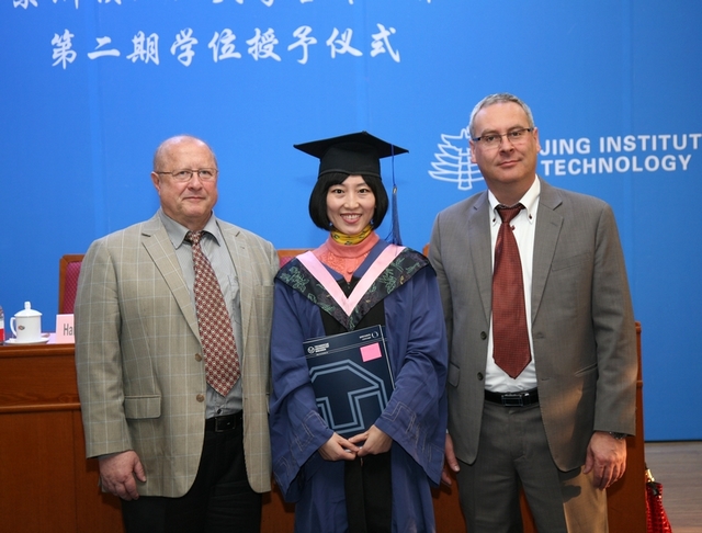 2014年3月8日下午,北京理工大学与德国德累斯顿工业大学合作培养职业教育硕士项目第二期学位授予仪式在我校国际教育交流大厦三层报告厅隆重举行。出席仪式的有我校副校长孙逢春教授,德累斯顿工业大学职业教育与人力资源开发硕士专业考试委员会主席Hanno Hortsch 教授、Steffen Kersten博士,我校国际交流处处长王庆林教授、国际教育学院院长梅文博教授、蒋志湘副院长。国际教育学院部分教职工、全体毕业生及部分学生家属一起参加了学位授予仪式。授予仪式由梅文博院长主持。