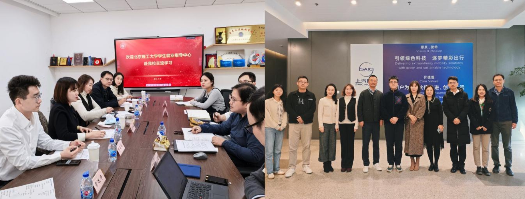 在上海调研期间,学生就业指导中心一行还前往复旦大学调研交流了学生就业工作和心理健康教育工作,围绕高质高效推进毕业生赴国际组织就业、校院就业工作人员队伍建设等方面开展了深入研讨。此外,还前往上海汽车集团股份有限公司总部开展了“访企拓岗”活动,重点针对学校异地研究院毕业生群体就业需求,就进一步建立校企就业联动机制、拓展高质量就业渠道等进行充分对接。