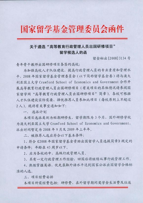 附件一:《关于遴选“高等教育行政管理人员出国研修项目”留学候选人的函》
