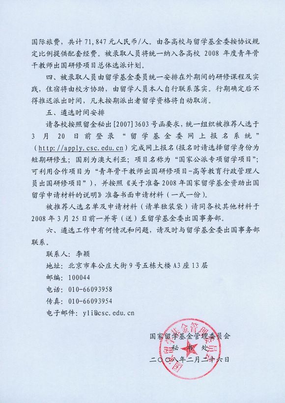 现将国家留学基金委《关于遴选“高等教育行政管理人员出国研修项目”留学候选人的函》转发给你们,请结合本单位实际,认真组织申报工作。申报人员请填写《北京理工大学行政管理人员出国研修申报表》,并附相关证明材料复印件,于2008年3月6日前送交党委组织部。