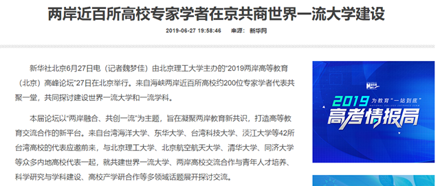 由北京理工大学主办的“2019两岸高等教育(北京)高峰论坛”27日在北京举行。来自海峡两岸近百所高校约200位专家学者代表共聚一堂,共同探讨建设世界一流大学和一流学科。