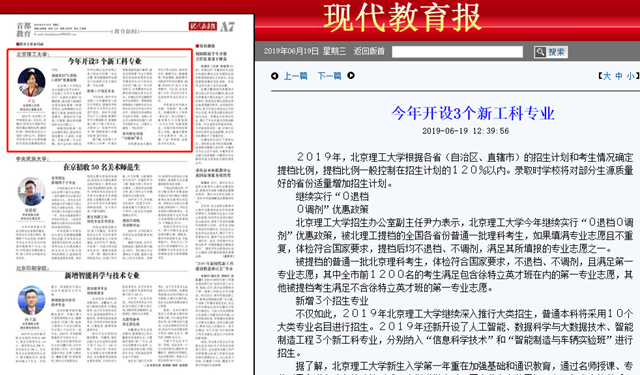 不仅如此,2019年北京理工大学继续深入推行大类招生,普通本科将采用10个大类专业名目进行招生。2019年还新开设了人工智能、数据科学与大数据技术、智能制造工程3个新工科专业,分别纳入“信息科学技术”和“智能制造与车辆实验班”进行招生。