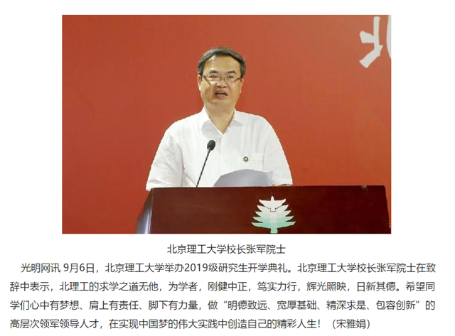 9月6日,北京理工大学举办2019级研究生开学典礼。北京理工大学校长张军院士在致辞中表示,北理工的求学之道无他,为学者,刚健中正,笃实力行,辉光照映,日新其德。希望同学们心中有梦想、肩上有责任、脚下有力量,做“明德致远、宽厚基础、精深求是、包容创新”的高层次领军领导人才,在实现中国梦的伟大实践中创造自己的精彩人生!(宋雅娟)