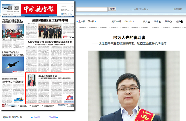 编辑:吴楠 审核:王征 阅读次数:原文标题:敢为人先的奋斗者——记江西青年五四奖章获得者、航空工业直升机所程伟