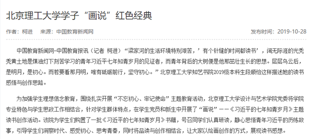 为加强学生理想信念教育,围绕扎实开展“不忘初心、牢记使命”主题教育活动,北京理工大学设计与艺术学院党委将学院专业特色与学生思政工作相结合,针对学生群体特点,在学生党员和新生中开展了“画说”——《习近平的七年知青岁月》主题读书创作活动。该院为学生们购置了一批《习近平的七年知青岁月》书籍,号召同学们认真研读,静心思悟青年习近平的历练故事,引导学生们洞察时代、感受初心、思考青春,同时将品读与创作相结合,让大家以绘画创作的方式,展现读书感想。