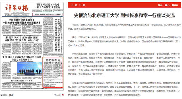 史根治向李和章一行介绍了许昌市情和经济社会发展情况。史根治说,许昌历史文化厚重,交通区位优越,民营经济发达,生态环境优良,发展活力充沛。特别是当前,许昌正致力建设“智造之都、宜居之城”,急需注入更多的智力、技术、项目等方面的优质资源。北京理工大学是在科技研发等多个领域走在前列的国内领军型高校,期待校地双方强强联合、加强合作,在已有合作成果的基础上,持续加强合作深度、拓展合作广度,落地更多有税收、有就业、可持续发展的优质项目。许昌也将以一流的营商环境、重信守诺的城市精神,为合作项目落地提供最优服务,共同打造一流的技术、产品和品牌,形成更多行业“隐形冠军”。