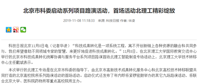 据悉,北京高校技术转移联盟是在北京市科委等支持下,由北大、清华、北理工等高校技术转移机构发起成立,目前已经集聚包括约40所北京重点高校在内的政产学研金等各类创新资源,在科技成果转化领域具有广泛影响力。