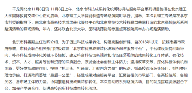 11月8日上午,北京市科技成果转化统筹协调与服务平台系列项目路演在北京理工大学国际教育交流中心正式启动,北京理工大学智能制造专场路演同时举行。据悉,本次北理工专场是在北京市科委的指导下,由北京市高新技术成果转化服务中心和北京高校技术转移联盟共同打造的北京高校院所系列路演活动的首场活动。年内,还将联合北京大学、医科院药物所等重点高校院所举办九场路演活动。
