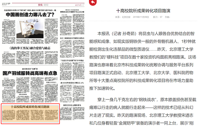 将昆虫与人眼各自优势结合的智能感知成像、如现实版钢铁侠一般的外骨骼机器人、1秒钟就能检测出生化违禁品的微型质谱仪……昨天,北京理工大学教授们的“硬科技”项目在数十家投资机构面前亮相路演。这场路演也意味着北京市科技成果转化统筹协调与服务平台系列项目路演正式启动,北京理工大学、北京大学、医科院药物所等十大重点高校院所的科技成果转化项目将在市场力量助推下加速转化。