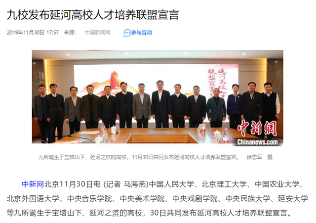 中国人民大学、北京理工大学、中国农业大学、北京外国语大学、中央音乐学院、中央美术学院、中央戏剧学院、中央民族大学、延安大学等九所诞生于宝塔山下、延河之滨的高校,30日共同发布延河高校人才培养联盟宣言。