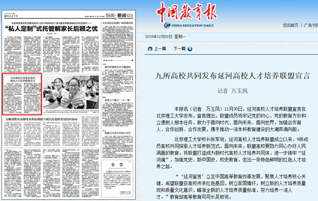 11月30日,延河高校人才培养联盟宣言在北京理工大学发布,宣言提出,联盟成员将牢记党的初心、党的教育方针和立德树人根本任务,致力于面向时代、面向未来、面向世界,加强合作育人、合作创新、合作发展,携手推动一流本科教育建设的大潮奔涌向前。