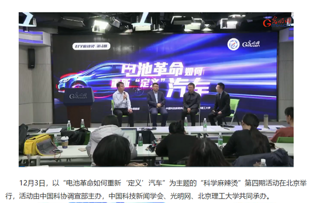 12月3日,以“电池革命如何重新‘定义’汽车”为主题的“科学麻辣烫”第四期活动在北京举行,活动由中国科协调宣部主办,中国科技新闻学会、光明网、北京理工大学共同承办。