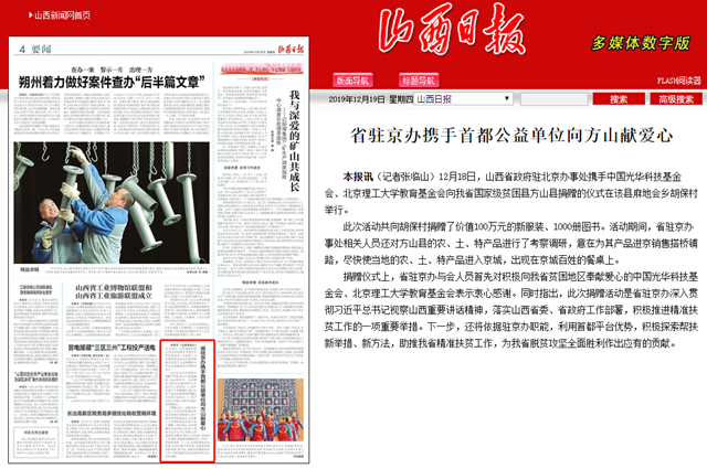 12月18日,山西省政府驻北京办事处携手中国光华科技基金会、北京理工大学教育基金会向我省国家级贫困县方山县捐赠的仪式在该县麻地会乡胡保村举行。
