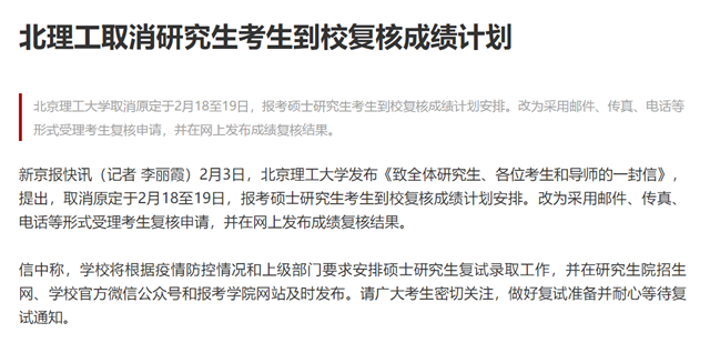 2月3日,北京理工大学发布《致全体研究生、各位考生和导师的一封信》,提出,取消原定于2月18至19日,报考硕士研究生考生到校复核成绩计划安排。改为采用邮件、传真、电话等形式受理考生复核申请,并在网上发布成绩复核结果。