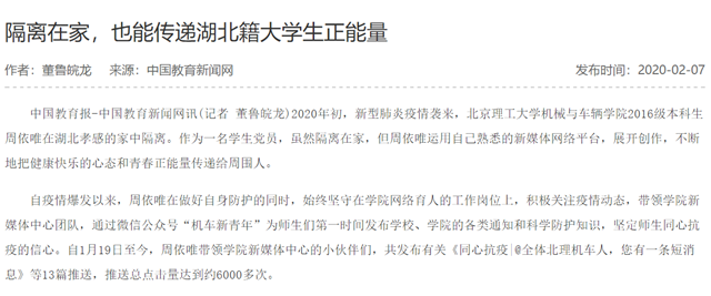2020年初,新型肺炎疫情袭来,北京理工大学机械与车辆学院2016级本科生周依唯在湖北孝感的家中隔离。作为一名学生党员,虽然隔离在家,但周依唯运用自己熟悉的新媒体网络平台,展开创作,不断地把健康快乐的心态和青春正能量传递给周围人。