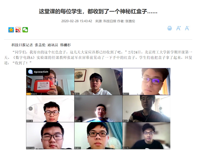 “同学们,我寄出的这个红色盒子,这几天大家应该都已经收到了吧。”2月24日,北京理工大学新学期开课第一天,《数字电路A》实验课的任课教师张延军在屏幕前晃动了一下手中的红盒子。学生们也把盒子拿了起来,回复道:“收到了!”