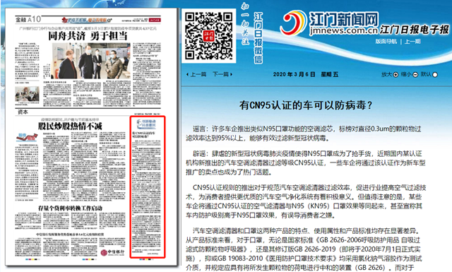 CN95认证规则的推出对于规范汽车空调滤清器过滤效率,促进行业提高空气过滤技术,为消费者提供更优质的汽车空气净化系统有着积极意义。但值得注意的是,某些车企将通过CN95认证的空气滤清器与N95(KN95)口罩效果等同起来,甚至宣称其车内防护级别高于N95口罩效果,有误导消费者之嫌。
