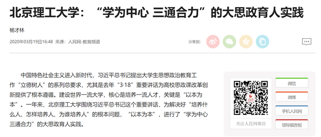 编辑:吴楠 审核:刘晓俏 阅读次数:原文标题:北京理工大学:“学为中心 三通合力”的大思政育人实践