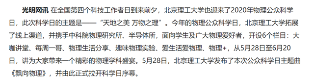 在全国第四个科技工作者日到来前夕,北京理工大学也迎来了2020年物理公众科学日,此次科学日的主题是——“天地之美 万物之理”。今年的物理公众科学日,北京理工大学拓展了线上渠道,并携手中科院物理研究所、半导体所,面向学生及广大物理爱好者,开设6个栏目:大咖讲堂、每周一哥、物理生活分享、趣味物理实验、爱生活爱物理、物理+,从5月28日至6月20日,为大家带来一个精彩的物理学科盛宴。5月28日,北京理工大学发布了本次公众科学日主题曲《飘向物理》,并由此正式拉开科学日序幕。