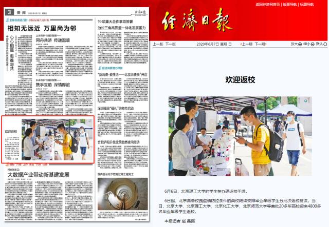 首页» 新闻网» 媒体北理» 媒体理工 欢迎返校 发布日期: 2020-06-08 供稿:经济日报 编辑:吴楠 审核:刘晓俏 阅读次数: 原文标题:欢迎返校 原文链接:http://paper.ce.cn/jjrb/html/2020-06/07/content_420582.htm 6月6日,北京理工大学的学生在办理返校手续。 6日起,北京具备校园疫情防控条件的高校陆续安排毕业年级学生分批次返校复课。当日,北京大学、北京理工大学、北京化工大学、北京师范大学等首批20多所高校迎来4800多名毕业年级学生返校。 分享到: 最新新闻 精彩推荐