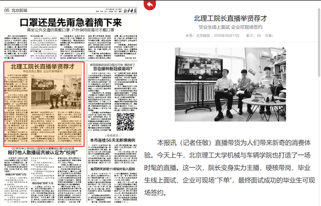 直播带货为人们带来新奇的消费体验。今天上午,北京理工大学机械与车辆学院也打造了一场时髦的直播。这一次,院长变身实力主播,硬核带岗,毕业生线上面试,企业可现场“下单”,最终面试成功的毕业生可现场签约。