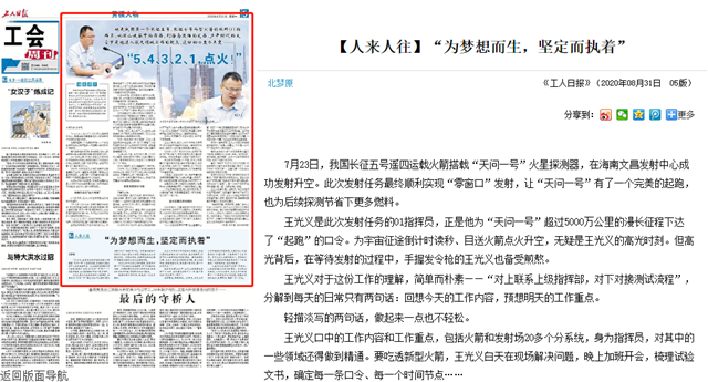 7月23日12时41分,海南文昌航天发射场,长征五号遥四运载火箭发射我国第一颗火星探测器“天问一号”取得圆满成功,迈出我国行星探测的第一步。执行这次发射任务的01指挥员就是王光义。