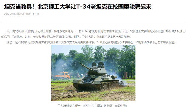 编辑:吴楠 审核:刘晓俏 阅读次数:原文标题:坦克当教具!北京理工大学让T-34老坦克在校园里驰骋起来