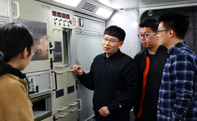 杨春华在空间模拟舱为课题组同学讲解生物实验平台关键技术