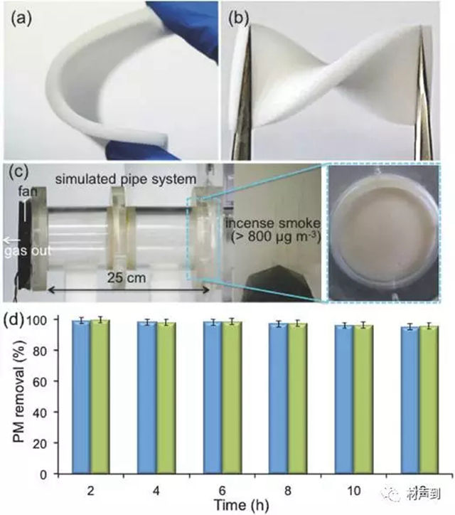 图3 ZIF-8@密胺泡沫的柔性展示和去除 PM 性能测试
