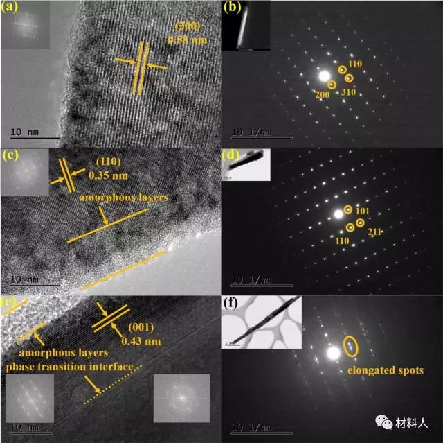放电后纳米线表面出现了一层约10 nm的无定形层,且在随后的充放电反应中都不会消失,充电后在无定形层内部出现了一个明显的相边界。说明Al3+的嵌入会破坏V2O5纳米线的表面结构形成亚稳态的无定形层,而这种无定形层的所占材料的体积的比例很可能和电池容量直接相关。