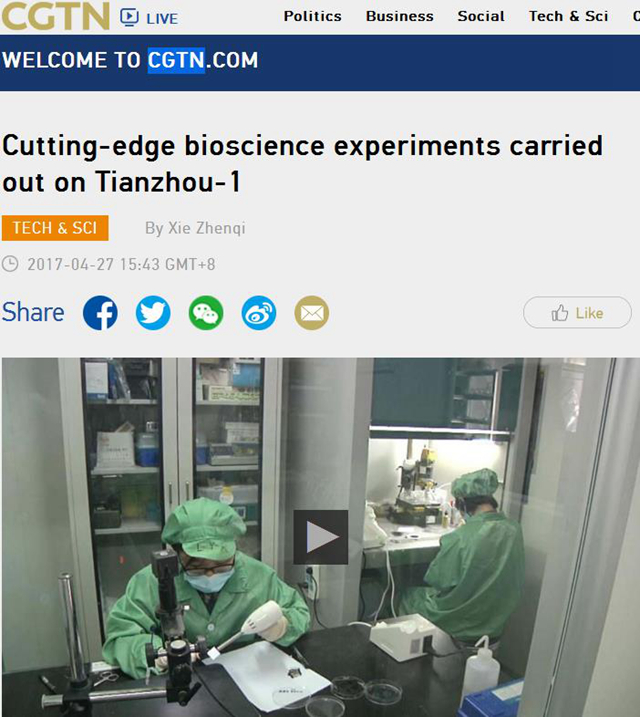 【中国国际电视台】CGTN报道北理工在天舟一号货运飞船上进行权威生命科学实验
