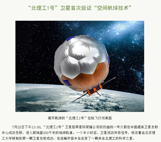 【科学网】“北理工1号”卫星首次验证“空间帆球技术”