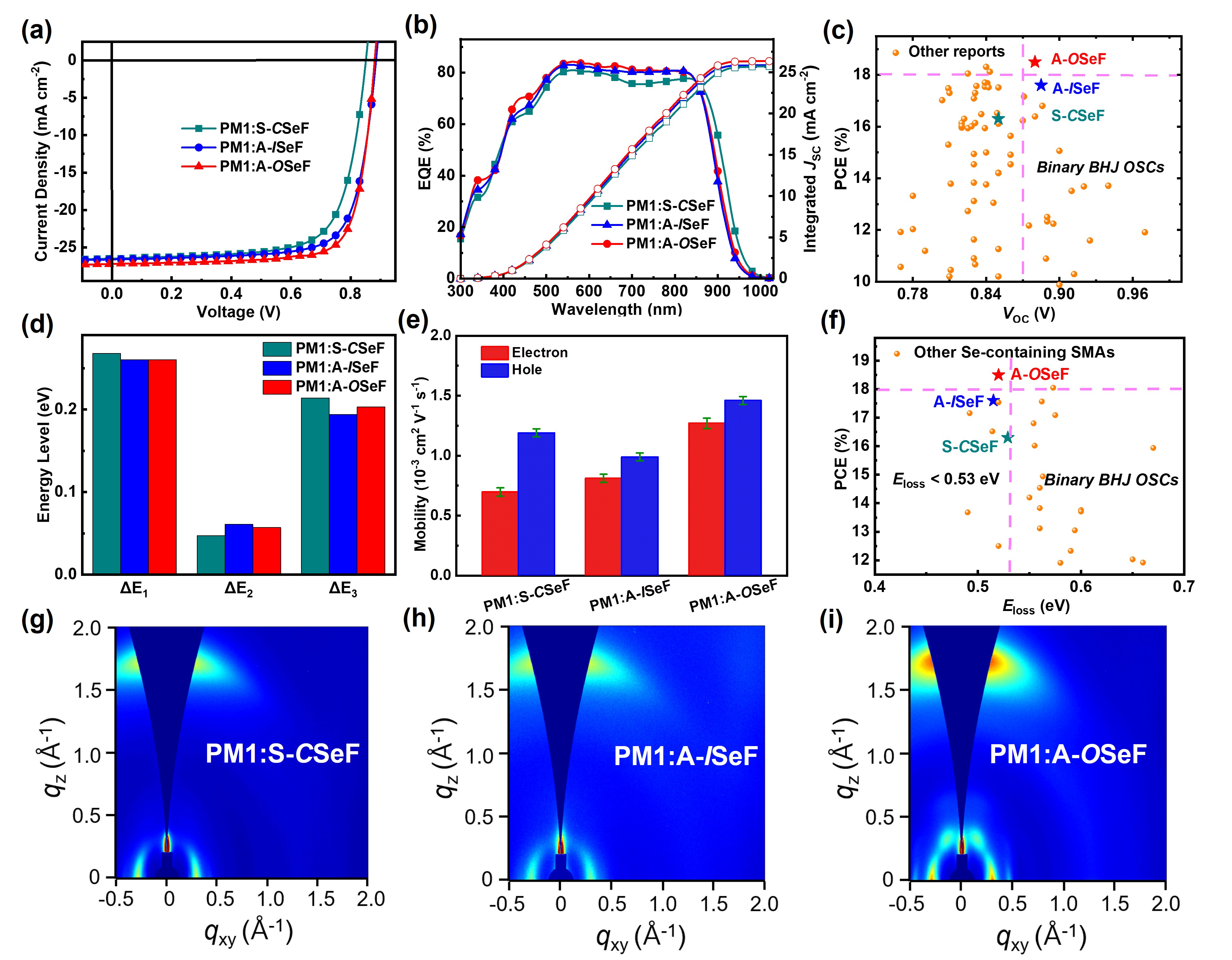 单晶堆积图显示,相比于S- C SeF和A- I SeF,基于最外侧硒取代核心的不对称A- O SeF由于额外的分子内Se-O和分子间F-Se非共价作用的存在,呈现出了平面性更强的分子骨架、更紧密更有序的3D网络堆积,促进了更高效的电子传输通道的形成。从S- C SeF到A- I SeF, 再到A- O SeF,随着单硒原子取代位置的外移,相应纯膜的光学带隙逐渐变宽、结晶性逐渐增强、电子迁移率逐渐增大。将其分别和商品化聚合物给体PM1共混后,基于A- O SeF的二元电池光电能量转换效率高达18.5%,明显高于基于A- I SeF(17.6%)和S- C SeF(16.3%)的器件结果。其性能的提升主要归因于A- O SeF抬升的LUMO能级以及最优的纳米纤维共混形貌和分子堆积,进而促进了更有效的激子产生和收集以及显著抑制了能量损失。值得一提的是,18.5%的光电能量转换效率是报道时基于硒取代小分子受体二元本体异质结型有机太阳能电池的效率记录值。综上,这项系统性的工作不仅证明了SMAs中硒取代位置和硒杂芳环类型的调控在优化晶体堆积行为和促进硒取代受体高效率和低能量损失平衡中的协同作用和重要性,而且对未来发展高性能的SMAs的协同设计原则提供了新的见解。