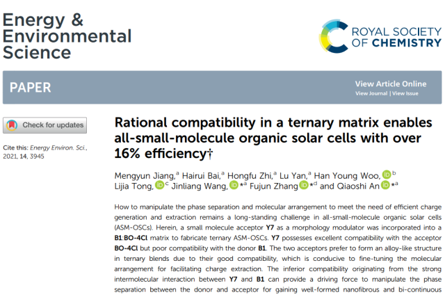 近日,北京理工大学化学与化工学院硕士研究生蒋梦云以第一作者身份在国际顶级期刊Energy Environmental & Science (IF: 38.5)发表题目为“Rational compatibility in a ternary matrix enables all-small-molecule organic solar cells with over 16% efficiency”的研究论文,此论文被选为该杂志2021年第7期的Front Cover。北京理工大学为第一通讯单位,北京理工大学安桥石特别研究员、王金亮教授和北京交通大学张福俊教授为共同通讯作者,本研究得到了国家自然科学基金,北京市自然科学基金和北京理工大学青年教师学术启动计划等项目的资助及北京理工大学分析测试中心的支持。