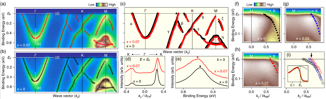 图5. Cs(V1-xNbx)3Sb5电子能带结构随温度和Nb掺杂浓度的演化
