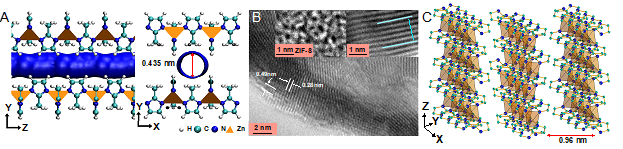图2. MOF-NS层间分子传递通道: (A)Zn2(MeIm)4的层间通道和孔径大小;(B)MOF-NS HR-TEM图像;(C)MOF-NS的层状结构和层间通道。