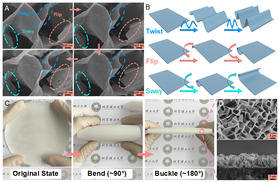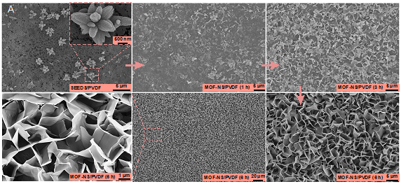 图3. MOF-NS/PVDF膜的高柔性结构: (A)MOF-NS/PVDF膜柔性可逆动态形变过程的SEM图像(包括翻转、扭转和摇摆);(B)MOF-NS/PVDF膜柔性可逆动态形变示意图。(C)MOF-NS/PVDF膜的弯曲测试。(D)MOF-NS/PVDF膜在弯曲后表面和断面的SEM图像。