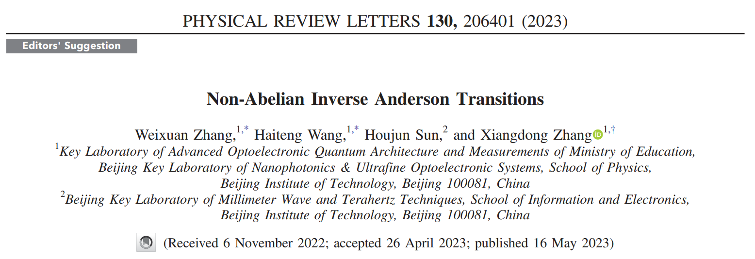 日前,北京理工大学物理学院张向东教授课题组和集成电路与电子学院孙厚军教授课题组开展合作,在拓扑电路和非阿贝尔逆安德森相变研究方面取得重要进展。相关工作发表在Physical Review Letters上 (Phys. Rev. Lett. 130, 206401 (2023)),并获得编辑推荐(Editors' Suggestion)。研究工作得到了国家自然科学基金委和国家重点研发计划的资助。北京理工大学物理学院张蔚暄研究员和硕士研究生王海藤为论文的共同第一作者,张向东教授      为通讯作者。