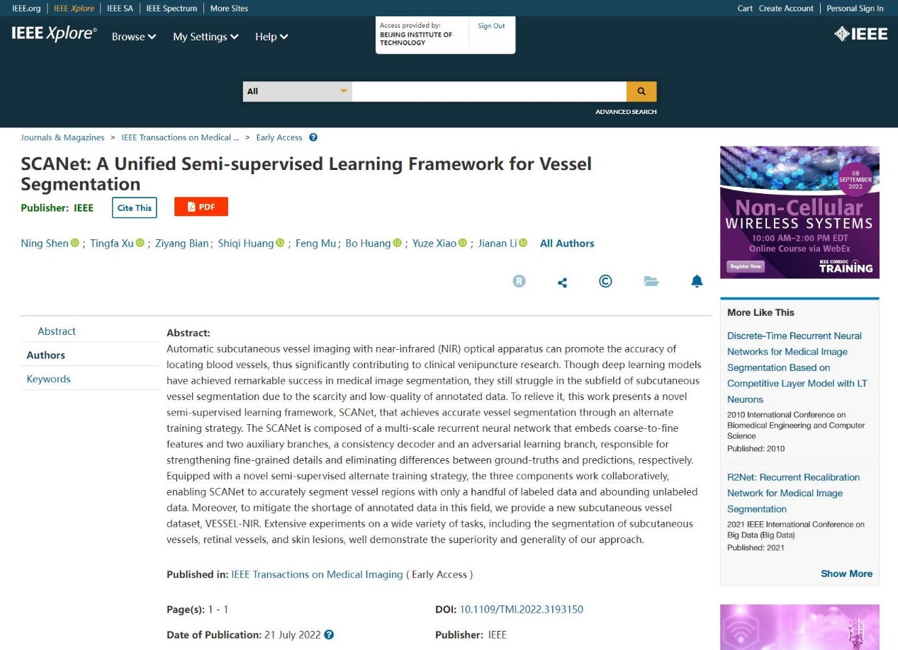 近日,北京理工大学光电学院许廷发教授科研团队在红外静脉血管医学图像处理领域取得新突破,相关研究成果以“SCANet: A Unified Semi-supervised Learning Framework for Vessel Segmentation”为题发表在医学图像处理领域的国际顶级期刊IEEE Transactions on Medical Imaging(IEEE TMI,IF="11.037)。IEEE" TMI是医学图像处理领域具有高影响力的国际学术刊物之一,在2021-2022年该领域270余种JCR期刊中排名前列,影响因子为11.037,中科院一区,主要发表和报道医学图像处理和分析、可视化和性能等领域的最新原创研究成果。该工作第一作者为北京理工大学光电学院博士研究生沈宁,通讯作者为北京理工大学光电学院李佳男特别副研究员和许廷发教授。