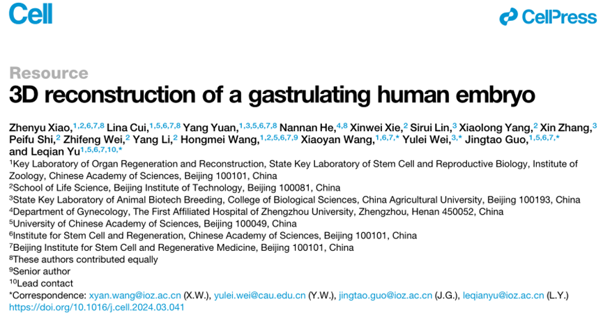 4月23日,北京理工大学生命学院肖振宇副教授、中国科学院动物研究所王红梅研究员、于乐谦研究员、郭靖涛研究员等在国际学术期刊Cell发表文章《3D Reconstruction of a Gastrulating Human Embryo》,基于芯片技术和三维动画重构技术首次重构高分辨率人类三维数字原肠胚,填补原肠胚阶段人类胚胎发育知识空白,为理解人类早期胚胎发育及相关疾病提供重要资料,为改善不良妊娠结局奠定科学基础。