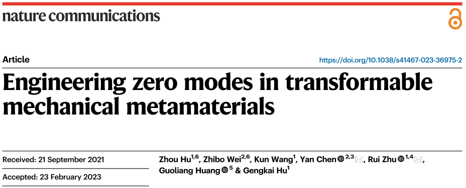 近日,北京理工大学大学宇航学院朱睿教授、胡更开教授研究组联合天津大学陈焱教授研究组和美国密苏里大学黄国良教授在可重构力学超材料研究方面取得新进展。相关成果以“Engineering zero modes in transformable mechanical metamaterials”为题,在Nature Communications上发表[Nat Commun (2023) 14:1266]。北京理工大学为第一通讯单位,北京理工大学宇航学院朱睿教授、天津大学陈焱教授为共同通讯作者,北京理工大学博士生胡洲和天津大学博士生魏志波为共同一作。该工作得到了国家自然科学基金委的资助。