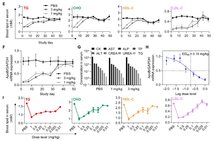 接着,研究人员用iLAND负载靶向ApoB基因的siRNA。在小鼠体内单次注射0.01-3 mg/kg该制剂后,检测到iLAND介导的半数有效剂量(ED50)低至0.18 mg/kg,单次给药后4周仍可实现约50%的基因抑制。此外,所有接受测试的动物均耐受良好,血清生化以及病理学分析结果也证明iLAND具有良好的体内安全性。