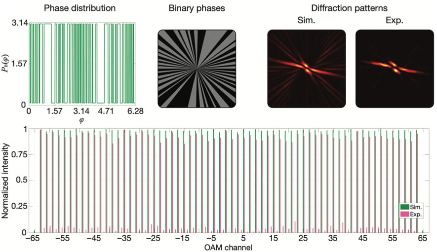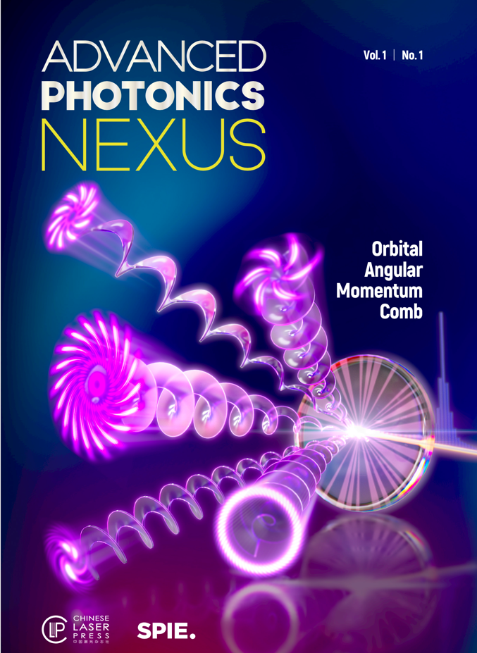 OAM光梳是一种在“ l 域”中由等模式间距的一系列分离OAM模式构成的复杂光场结构,其为超高光子效率信息编码的载体,同时也是高密度全息加密技术的“钥匙”。先前研究已经证明,采用纯相位调制方法不可能将基模高斯光束转化为OAM光梳,若要获得OAM光梳,则必须采用迭代等方法无限逼近,而迭代过程是费时的,将高维信号编码的优势抵消殆尽。针对这一问题,该团队从达曼光栅技术获得灵感,构建了 x 坐标与 φ 坐标的映射关系,研制了角向二值化相位结构衍射光学器件,最终实验获得了127维OAM光梳,模式均匀性达92.04%,如图1所示。由于不同的OAM光束对应固定的角向二值化相位的相位跃变点坐标,使得可根据数值解而无需任何迭代运算即可生成任意OAM光梳,有效的解决了现有技术生成高维OAM光束响应时间长的问题。该团队公开了不同OAM光梳下角向二值化相位的相位跃变点坐标数值解,可供本领域科研及技术人员直接调用。该工作为高维涡旋光场调控提供了全新思路,发表于CLP与SPIE新办刊物Advanced Photonics Nexus,并被选为AP Nexus创刊首期封面,如图2所示。付时尧副研究员是该文的第一作者及通讯作者,高春清教授为该文的共同通讯作者。