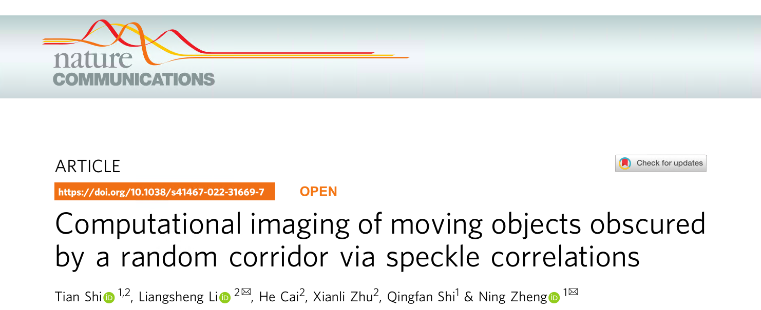 近日,北京理工大学物理学院郑宁教授团队和北京环境特性研究所的李粮生研究员团队,在《Nature Communications》发表题为 “Computational imaging of moving objects obscured by a random corridor via speckle correlations” 的文章。团队提出了一种新型的散斑关联方法,实现了对随机走廊(包含随机介质的曲折走廊)中隐藏目标的成像,同时定量分析了该方法的成像适用范围。北京理工大学的博士研究生石天为论文的第一作者,郑宁教授和李粮生研究员为论文的共同通讯作者。论文的合作者包括北京理工大学的史庆藩教授,北京环境特性研究所的工作人员蔡禾和朱先立。