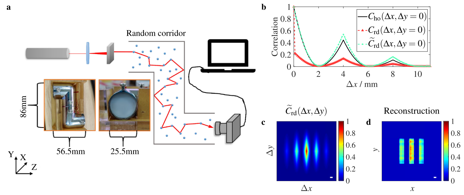 图2 成像位于随机走廊两个拐角后的隐藏目标。a 实验成像系统原理图。b 隐藏目标自关联函数、散斑光强关联函数、重整化散斑光强关联函数三者的对比。c 重整化散斑光强关联函数。d 由重整化散斑光强关联函数重建出的隐藏目标图像。