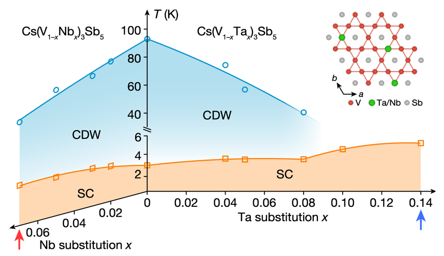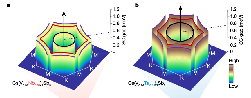 进一步地,研究人员通过细致的化学替换,将部分钒原子可控地替换为同族更大的铌或钽原子,从而精确调控超导序和电荷密度波序(图2)。通过对相图中有无电荷密度波序的区域进行比对研究,发现超导能隙均显示为无节点和各向同性(图3)。如此稳健的能隙结构极大缩窄了超导配对对称性的候选范围,同时结合缪子散射实验发现该超导态破坏时间反演对称性,指向了 d + id 波超导配对的可能性。