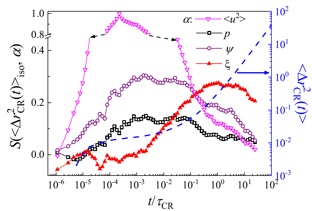 图3 不同的静态量包括Debye-Waller因子< u 2>,其简谐近似下的均方位移ψ,低频振动模的参与分数p,以及塑性长度ξ与动态量<<∆r2CR(t)>>的Spearman等级相关系数S。