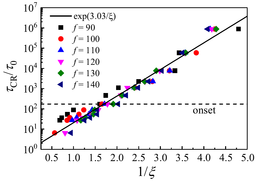 团队设计了新的探测玻璃体系静态结构的手段,具体为,在短时间内,对粒子施加一固定大小,方向随机选取的力,观察撤去力之后,粒子不能回弹的位移,即不可逆位移有多大。图1(a)展示了当对粒子在0.1(约化单位)时间间隔内施加一外力大小为f = 100(约化单位)的力时,粒子平均位移随时间的演化规律。较长时间下,此平均位移趋近一平台值,即黑色虚线标出的不可逆位移L(T, f),显然,温度越低,不可逆位移L(T, f)越小。近一步的研究发现,L(T, f)正比于 T  -  T 0 (图1 (b)),其中 T 0为Vogel–Fulcher–Tammann (VFT) 方程预测的非晶体系的理想玻璃化转变点,因此,L(T, f)在理想玻璃化转变点外推为0。进一步分离变量,我们可得到L(T, f) = ξ(T)A(f), 其中塑性长度ξ(T)∝( T  -  T 0 ), A(f) ∝( f  -  f 0)。塑性长度ξ(T)与体系弛豫时间存在指数依赖关系(图2),因此建立了塑性长度与非晶体系慢动力学的联系。