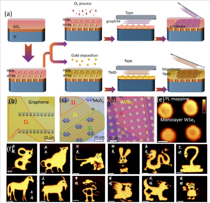 图1  二维材料悬浮结构的制备路线图(a)及解理后的二维材料(b-d),解理后的悬浮WSe2展现出良好的荧光特性(e)。(f)是将衬底图案化(十二生肖图案)加工后,通过优化解理工艺制备的悬浮WSe2荧光成像图片。